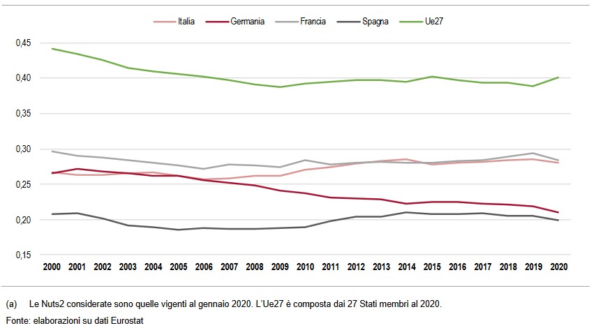 Fig. 1 – Le disparità territoriali misurate attraverso il coefficiente di variazione del Pil pro capite in PPA nei territori (NUTS2)(a)  dell’UE27 e nei principali stati membri fra il 2000 e il 2021 (a)