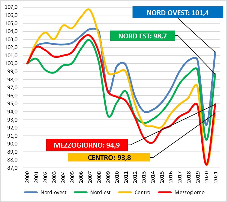 Il divario tra Nord e Sud Italia, in particolare, è andato accentuandosi nel corso degli anni. Mentre le regioni del Nordest e del Nordovest registrano indici di PIL pro-capite superiori alla media del 2000, il Centro e il Mezzogiorno faticano a tenere il passo, con un gap che si è allargato significativamente rispetto alle aree più produttive del Paese.