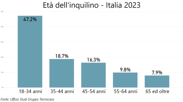 L’età degli inquilini si concentra maggiormente nella fascia tra i 18 e i 34 anni, che rappresenta il 47,2% del totale degli affitti stipulati nel 2023, con una progressiva diminuzione delle percentuali all’aumentare dell’età.