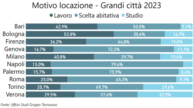 Le città che vedono una maggiore prevalenza di contratti a canone libero sono Bologna (77,8%) e Milano (62,3%), mentre a Roma predomina il canone concordato (64,1%). Genova e Verona seguono questa tendenza, con il 69,2% e il 56,9% rispettivamente.