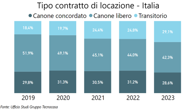A livello nazionale, la tendenza vede una riduzione dei contratti a canone libero, passati dal 51,9% del 2019 al 42,3% del 2023, a fronte di un significativo incremento dei contratti transitori, che sono saliti dal 18,4% al 29,1%. Questo cambiamento è in parte attribuibile all’aumento della presenza di studenti universitari e alla necessità di maggiore flessibilità contrattuale.