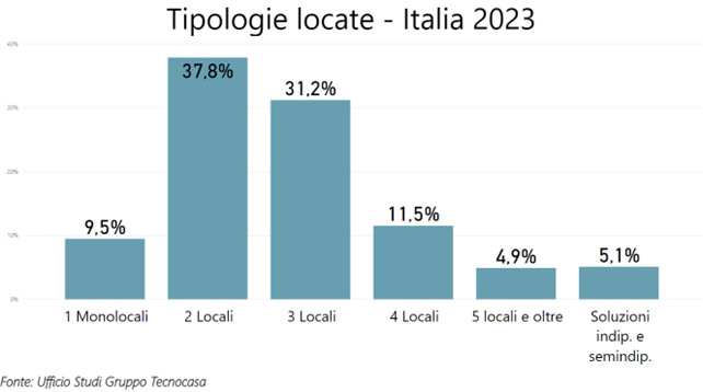 Sul fronte delle tipologie di appartamenti più affittati, il bilocale rimane la scelta più comune con il 37,8%, seguito dal trilocale con il 31,2%. Tuttavia, si nota un aumento nella richiesta di monolocali, che dal 7,5% del 2019 sono saliti al 9,5% nel 2023, segno di una crescente preferenza per soluzioni abitative più compatte e spesso più economiche.