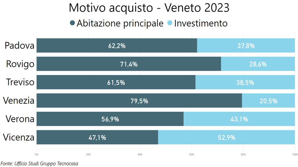 A livello regionale, il Veneto ha visto il 22,6% delle compravendite concluse da investitori nel 2023, con il restante 69,9% rappresentato da acquisti di abitazioni principali e il 7,5% da case vacanza. Anche su scala regionale, si nota un incremento degli acquisti per investimento rispetto al 2022, quando la percentuale si attestava al 19,3%.