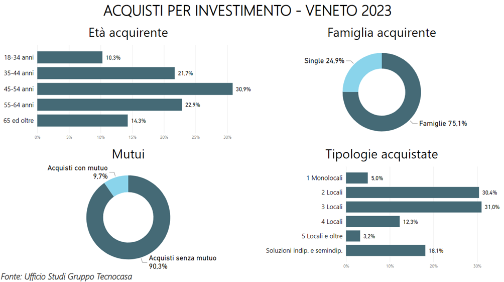 Gli investitori nel mercato immobiliare veneto sono principalmente famiglie (75,1%), con una fascia d’età predominante tra i 45 e i 54 anni (30,9%). Le tipologie di immobili più ricercate per investimento sono i trilocali (31%) e i bilocali (30,2%). Inoltre, la stragrande maggioranza degli acquisti per investimento (90,3%) viene effettuata in contanti, mentre solo il 9,7% degli acquirenti ricorre a un mutuo bancario, una diminuzione rispetto all’11,7% del 2022, dovuta in parte all’aumento dei tassi di interesse sui mutui.