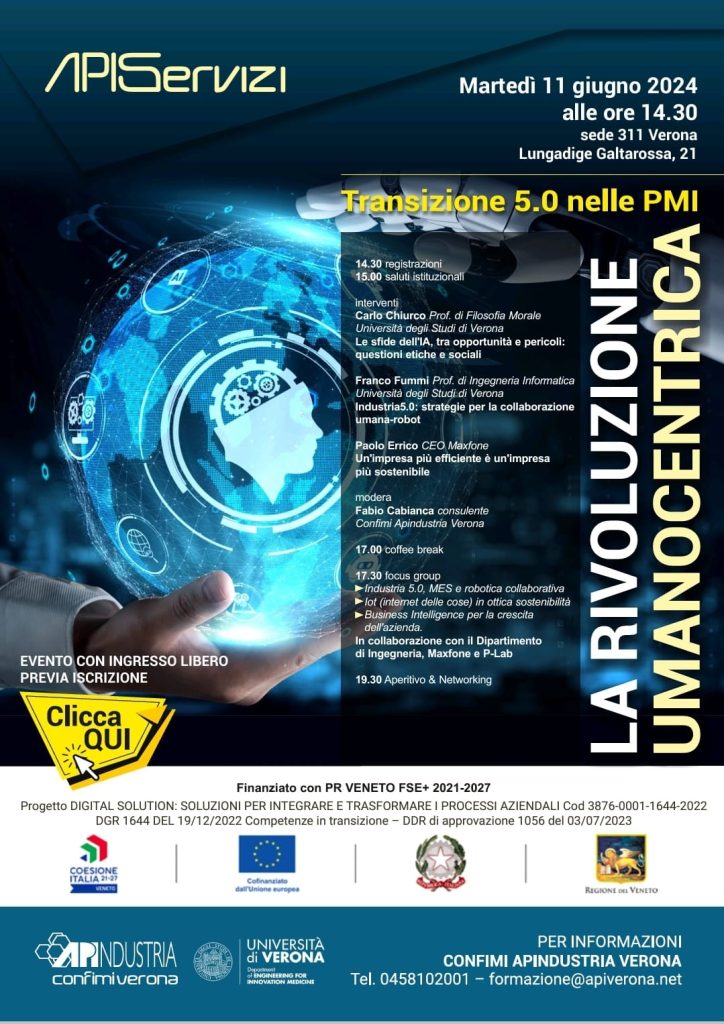 Questo seminario rappresenta un’importante occasione per le PMI di Verona e dintorni per aggiornarsi sulle innovazioni tecnologiche e le strategie necessarie per affrontare la transizione verso l’Industria 5.0, mettendo l’uomo al centro del processo di innovazione.