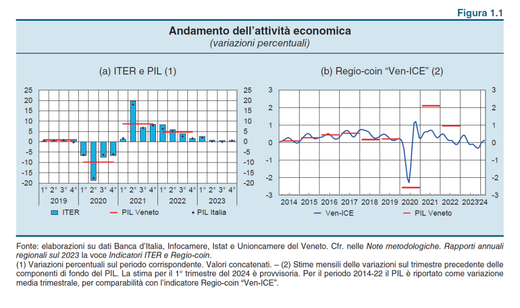 Secondo l’indicatore trimestrale dell’economia regionale (ITER) elaborato dalla Banca d’Italia, nel 2023 il prodotto regionale è cresciuto in termini reali dell’1,1%, in linea con il dato nazionale (0,9%), ma in forte rallentamento rispetto al 2022 (4,9%). L’indicatore Ven-ICE ha segnalato una diminuzione dell’attività economica nella seconda metà del 2023, con una ripresa nei primi tre mesi del 2024.