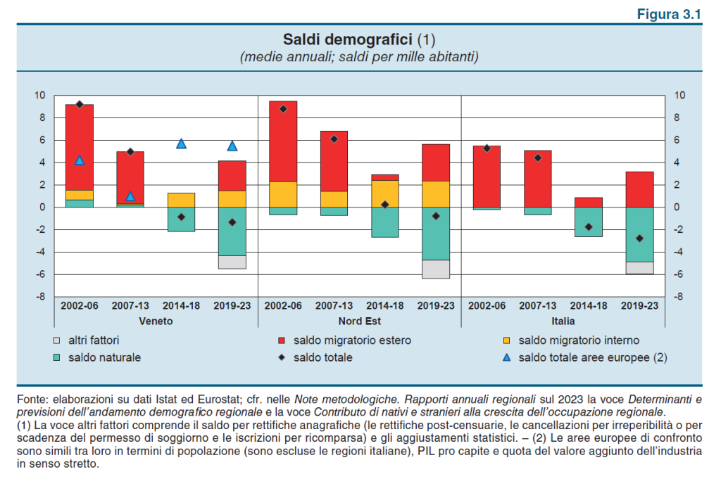 Negli ultimi dieci anni, la popolazione del Veneto è diminuita e si è invecchiata, con effetti significativi sul mercato del lavoro e sulla crescita economica. Diversamente da altre regioni europee, il Veneto non ha compensato questo impatto con un forte aumento della produttività, contribuendo alla bassa crescita del PIL pro capite degli ultimi vent’anni. È cruciale mantenere, attrarre e formare capitale umano specializzato e aumentare la partecipazione femminile al mercato del lavoro. Nonostante un saldo positivo tra entrate e uscite di laureati da e verso altre regioni italiane, il Veneto presenta un saldo negativo con l’estero. Il tasso di attività femminile è in crescita, ma rimane inferiore a quello maschile.