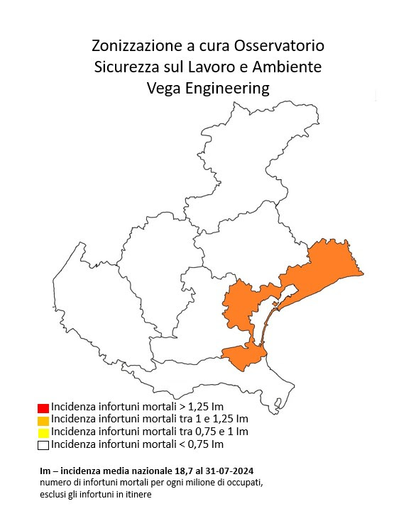 Tra le province, Verona ha registrato il maggior numero di decessi (11), seguita da Venezia (10), Padova (9), Treviso (4), Vicenza (2) e Belluno (1). Venezia è l’unica provincia del Veneto classificata in “zona arancione”, con un’incidenza di mortalità di 213 morti per milione di occupati, mentre tutte le altre province sono in “zona bianca”.