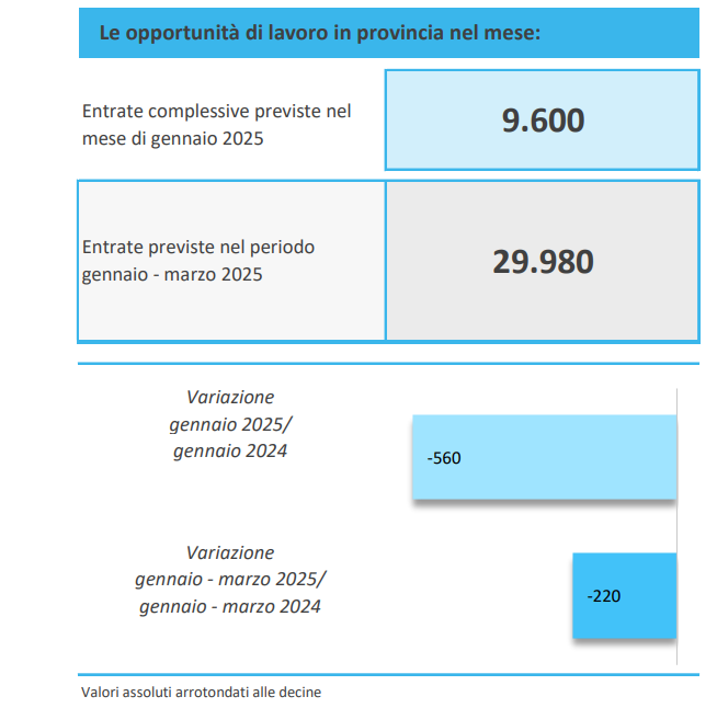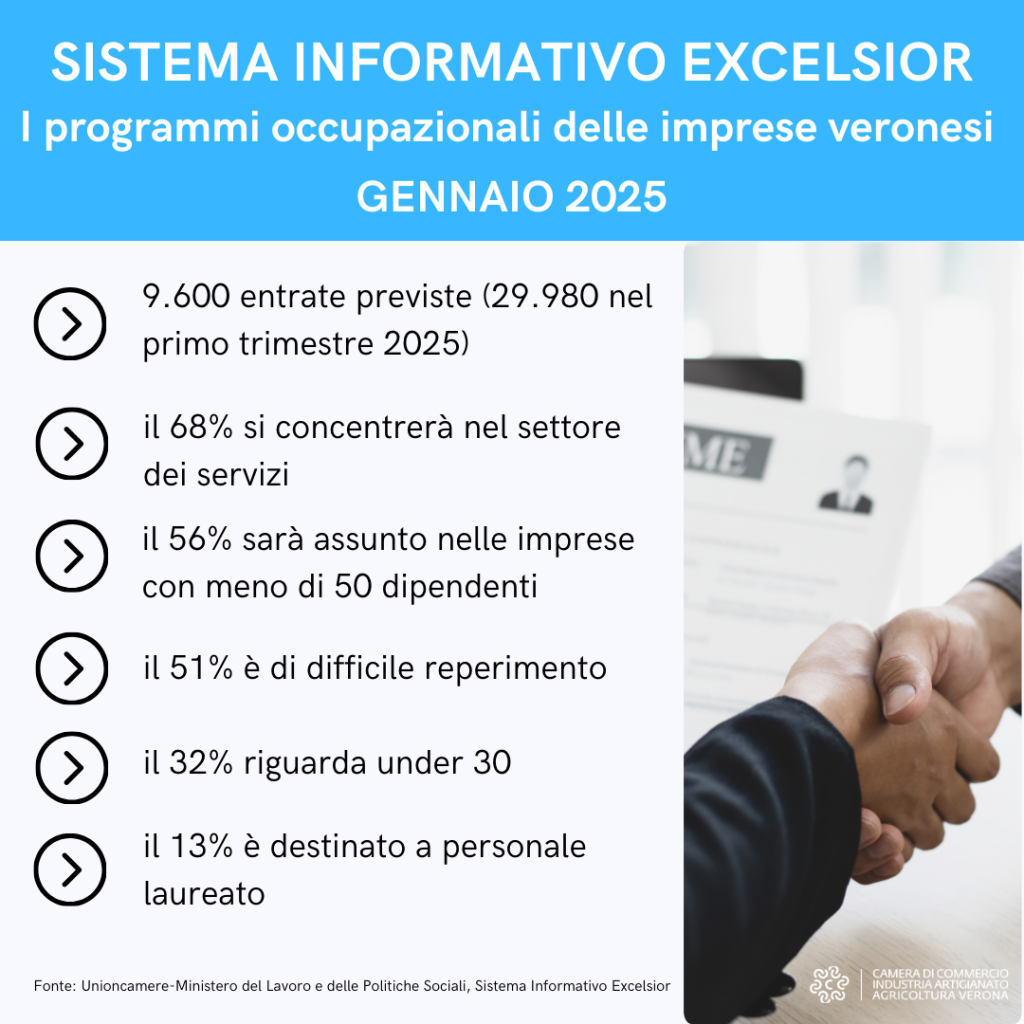 di Matteo ScolariSecondo il Sistema Informativo Excelsior di Unioncamere e del Ministero del Lavoro e delle Politiche Sociali, nel mese di gennaio 2025 sono previste 9.600 nuove assunzioni da parte delle imprese della provincia di Verona, con un calo del 6% rispetto allo stesso periodo del 2024. Questo dato si inserisce in una stima trimestrale che prevede un totale di 29.980 entrate nel primo trimestre del nuovo anno.