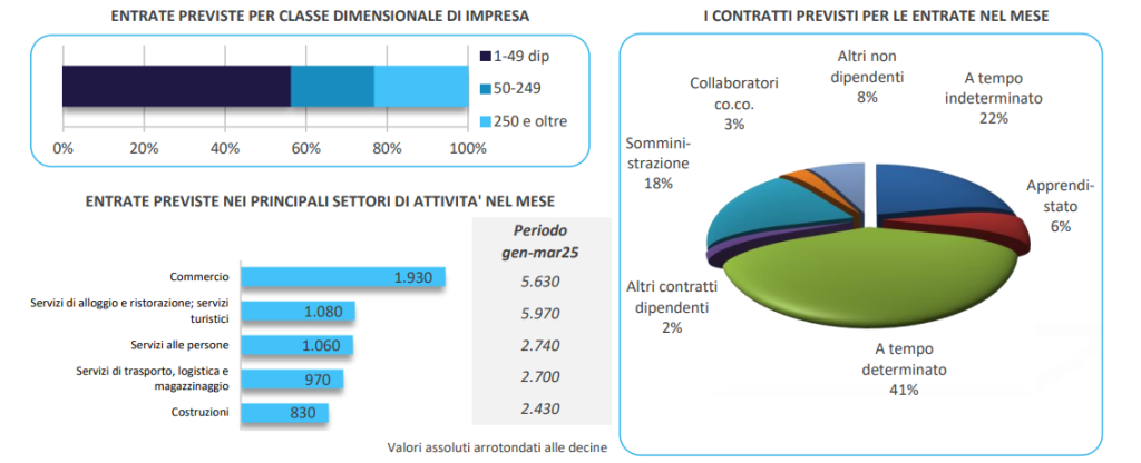 Il commercio si conferma il settore con il maggior numero di richieste, con 1.930 assunzioni programmate. Seguono i servizi di alloggio e ristorazione e il turismo (1.080 entrate), i servizi alle persone (1.060), la logistica e i trasporti (970) e, infine, il comparto delle costruzioni con 830 nuove posizioni.
