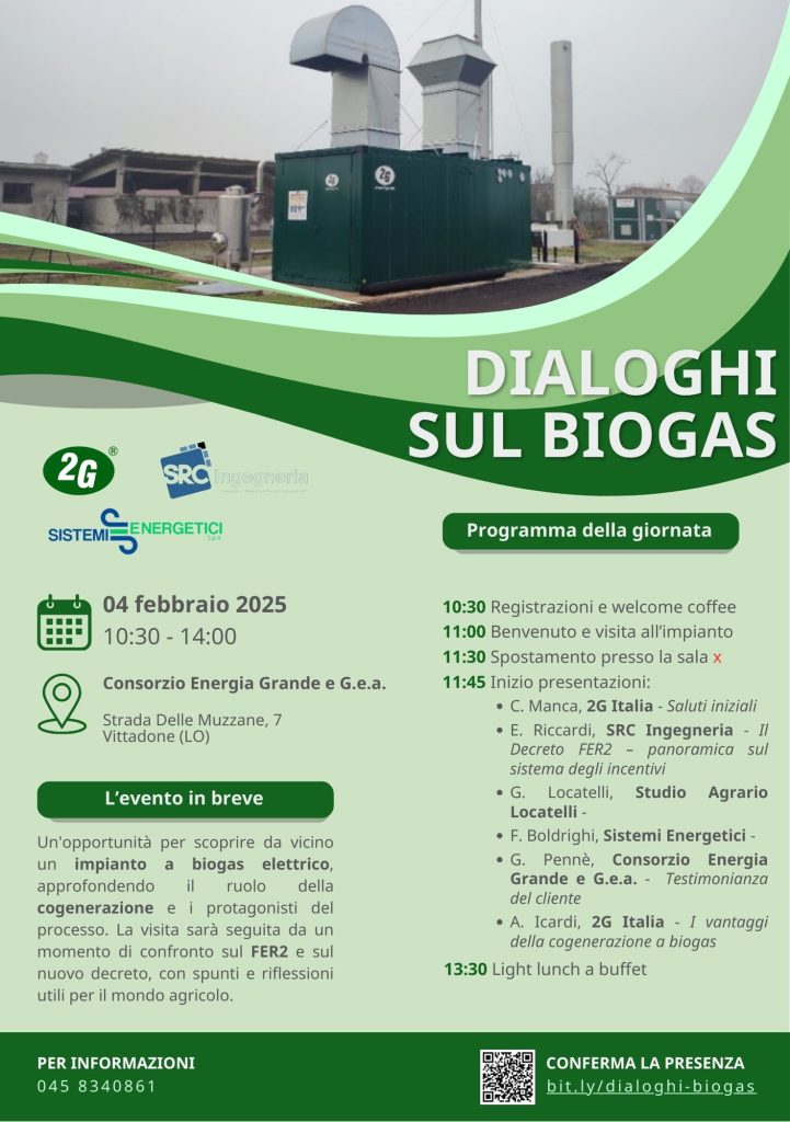 A seguire, il 4 febbraio, i Dialoghi sul Biogas si terranno presso il Consorzio Energia Grande e G.E.A., nel cuore agricolo della Lombardia. Questo evento sul campo include la visita a un impianto di cogenerazione e una serie di interventi tecnici, tra cui: Enrico Riccardi (SRC Ingegneria) sul Decreto FER2; Giancarlo Locatelli (Studio Agrario Locatelli) sulla progettazione degli impianti; Fabio Boldrighi (Sistemi Energetici) sulle tecnologie avanzate per la cogenerazione; Alberto Icardi (2G Italia) sui benefici pratici della cogenerazione a biogas.