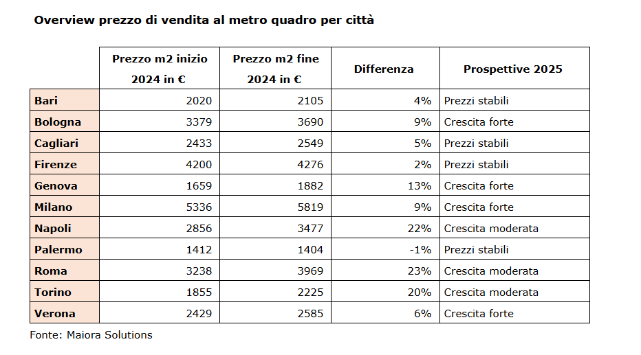 «Il 2024 è stato un anno di crescita moderata per il mercato residenziale nazionale – commenta Andrea Torassa, fondatore di Maiora Solutions –. Attraverso EPONA, il nostro strumento di intelligenza artificiale dedicato agli investimenti immobiliari, abbiamo analizzato i trend in 10 tra le principali città italiane e l’aumento di prezzi è stato comune, da Nord a Sud. Abbiamo riscontrato evidenze interessanti, soprattutto in città come Roma, Napoli e Torino dove invece l’aumento dei prezzi ha mediamente superato il 20%. C’è poi il caso di Palermo, unica città italiana con trend negativo, seppur molto limitato. Per il 2025 le nostre previsioni indicano che la crescita dei prezzi si manterrà costante, ma generalmente contenuta nel Paese, con le eccezioni di Milano, Verona, Bologna e Genova dove invece ci attendiamo una crescita più consistente dei prezzi al metro quadro».