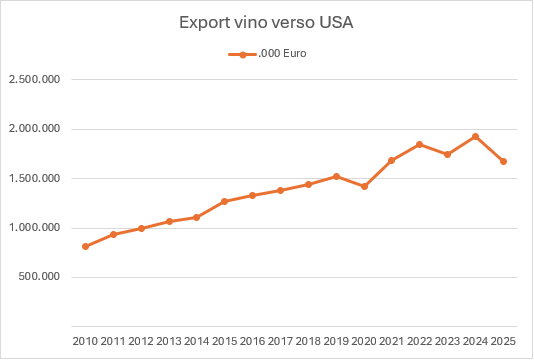 Gli Stati Uniti rappresentano il primo mercato per il vino italiano, con esportazioni che nel 2024 supereranno i 1,9 miliardi di euro, pari al 24% dell’export totale del settore. La nuova imposizione tariffaria potrebbe portare il valore delle esportazioni sotto 1,7 miliardi di euro, scendendo così ai livelli del 2021.
