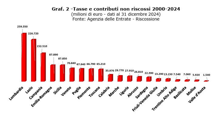 Il problema dell’evasione fiscale ha un forte impatto territoriale. Il 58% dei mancati incassi è concentrato nel Centro-Sud, con 739,3 miliardi di euro non riscossi. Le regioni più colpite sono il Lazio, con un debito fiscale pro capite di 39.673 euro, seguito da Campania (27.264 euro), Lombardia (25.904 euro), Molise (20.469 euro) e Marche (20.078 euro). In valore assoluto, la Lombardia guida la classifica con 259,4 miliardi di euro di tributi non versati, seguita da Lazio (226,7 miliardi), Campania (152,5 miliardi), Emilia-Romagna (87,9 miliardi) e Sicilia (87,8 miliardi).