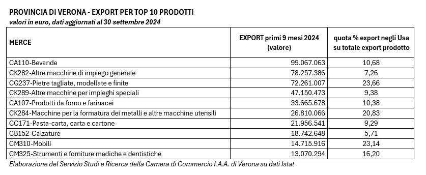 Sebbene gli Stati Uniti incidano per il 5,5% sul totale delle esportazioni veronesi, un dato inferiore alla media nazionale del 10%, alcuni settori risultano particolarmente esposti. Il presidente della Camera di Commercio di Verona, Giuseppe Riello, sottolinea che tra i comparti più a rischio figurano le bevande, con una quota del 10,7% dell’export totale e un incremento del 7,6% al terzo trimestre 2024, per un valore di 99 milioni di euro. Il settore del marmo e delle pietre lavorate è quello più vulnerabile, con un quarto delle esportazioni (23,7%) destinate agli USA. Anche i macchinari industriali subirebbero forti conseguenze, in particolare quelli per la metallurgia, l’industria alimentare, la carta e la lavorazione di metalli, legno e pietre. La filiera dei prodotti da forno ha un’incidenza del 10,4% sull’export, mentre il comparto dell’arredo vede gli USA come principale mercato estero, con una quota del 23,1% delle esportazioni totali.