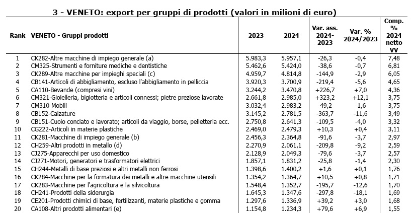 I principali prodotti italiani esportati nel 2024 includono medicinali e preparati farmaceutici (50,8 miliardi, +10,3%), macchinari generici, autoveicoli, ma anche gioielleria (+38,9%) e prodotti alimentari. In questo contesto, l’elevata presenza del Veneto in comparti ad alto valore aggiunto e fortemente richiesti a livello globale conferma la sua capacità di adattarsi a dinamiche mutevoli.