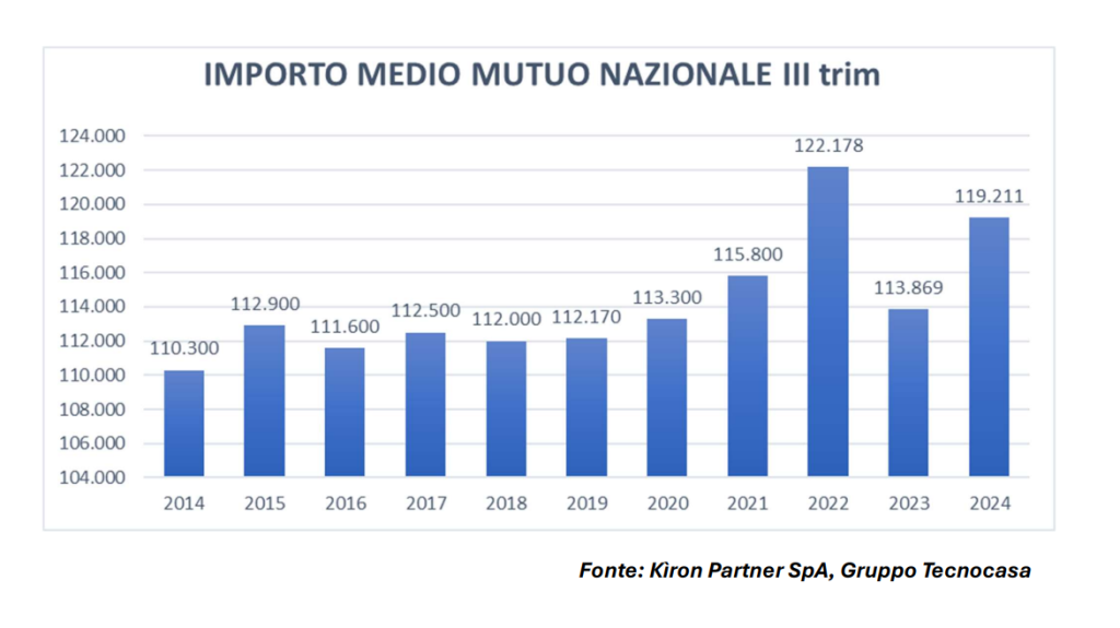 Secondo quanto riportato nello studio, relativo al terzo trimestre 2024, l’importo medio erogato per ogni operazione di mutuo si attesta a 119.211 euro, con un incremento del +4,7% rispetto ai 113.000 euro del 2023. Un dato che riporta i valori quasi ai livelli del 2022, quando si era superata la soglia dei 122.000 euro.