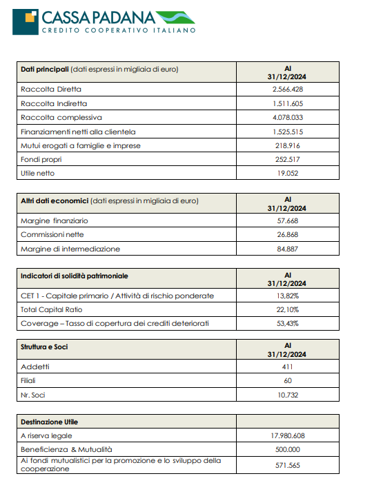 Le masse amministrate per conto della clientela – comprendenti raccolta diretta, amministrata e risparmio gestito – hanno superato i 4 miliardi e 78 milioni di euro, con una crescita annua del 10,69%. Gli impieghi hanno raggiunto 1 miliardo e 526 milioni, mentre i mutui erogati a famiglie e imprese nel corso dell’anno sono stati pari a 219 milioni. I clienti sono cresciuti del 3,2%, confermando la crescente fiducia nel modello di banca cooperativa promosso da Cassa Padana.