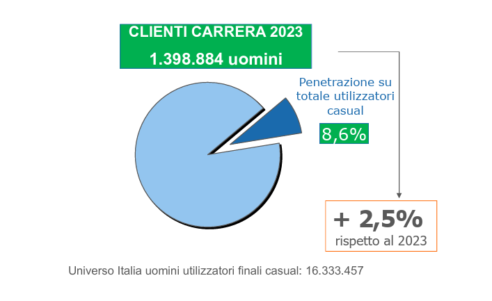 Nel 2024, Carrera ha raggiunto 1.398.884 clienti uomini, corrispondenti all’8,6% dell’universo maschile casual italiano, stimato in oltre 16,3 milioni di utilizzatori finali. Questo dato consolida il posizionamento del brand come punto di riferimento assoluto per il denim nel nostro Paese.