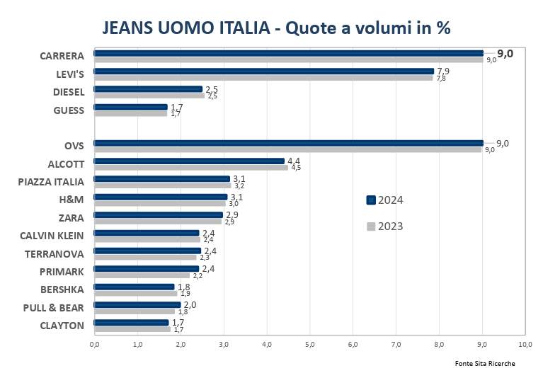 Analizzando le quote a volumi nel segmento “Jeans Uomo”, Carrera si piazza al primo posto con il 9,0%, a pari merito con OVS, seguita da Levi’s (7,9%). Anche nella categoria più ampia dei pantaloni uomo, Carrera mantiene il vertice con una quota del 7,7%, a dimostrazione di una fedeltà crescente da parte dei consumatori italiani.