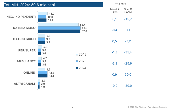 Al contrario, i canali tradizionali come iper/supermercati e ambulanti registrano un calo progressivo. L’e-commerce si conferma il motore più dinamico, con una crescita sostenuta rispetto al periodo pre-pandemico (+30% rispetto al 2019).
