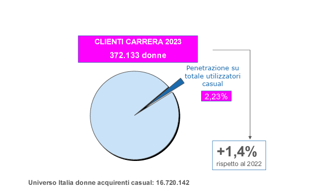 Anche il segmento femminile mostra segnali incoraggianti per Carrera, con 372.133 donne clienti nel 2023, pari a una penetrazione del 2,23% sull’universo di 16,7 milioni di utilizzatrici casual, in crescita del +1,4% rispetto al 2022.