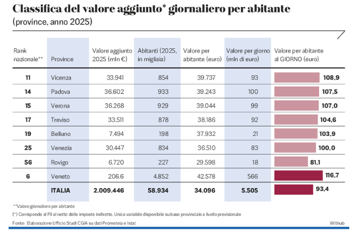 In questo quadro, Verona conferma il suo posizionamento di eccellenza nel contesto produttivo italiano. Secondo un’analisi della CGIA di Mestre su dati Prometeia e Istat, la provincia scaligera è 15ª in Italia per valore aggiunto pro capite, con 107 euro di ricchezza prodotta al giorno per abitante, inclusi bambini e anziani. Il valore aggiunto complessivo è stimato in 36,2 miliardi di euro. In Veneto fanno meglio solo Vicenza (108,9 euro) e Padova (107,5).