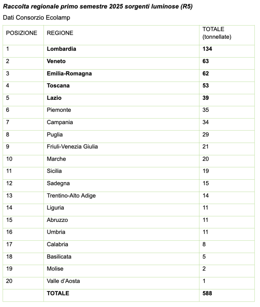 RAEE: in Veneto raccolte 63 tonnellate di sorgenti luminose riciclate nel primo semestre 2025