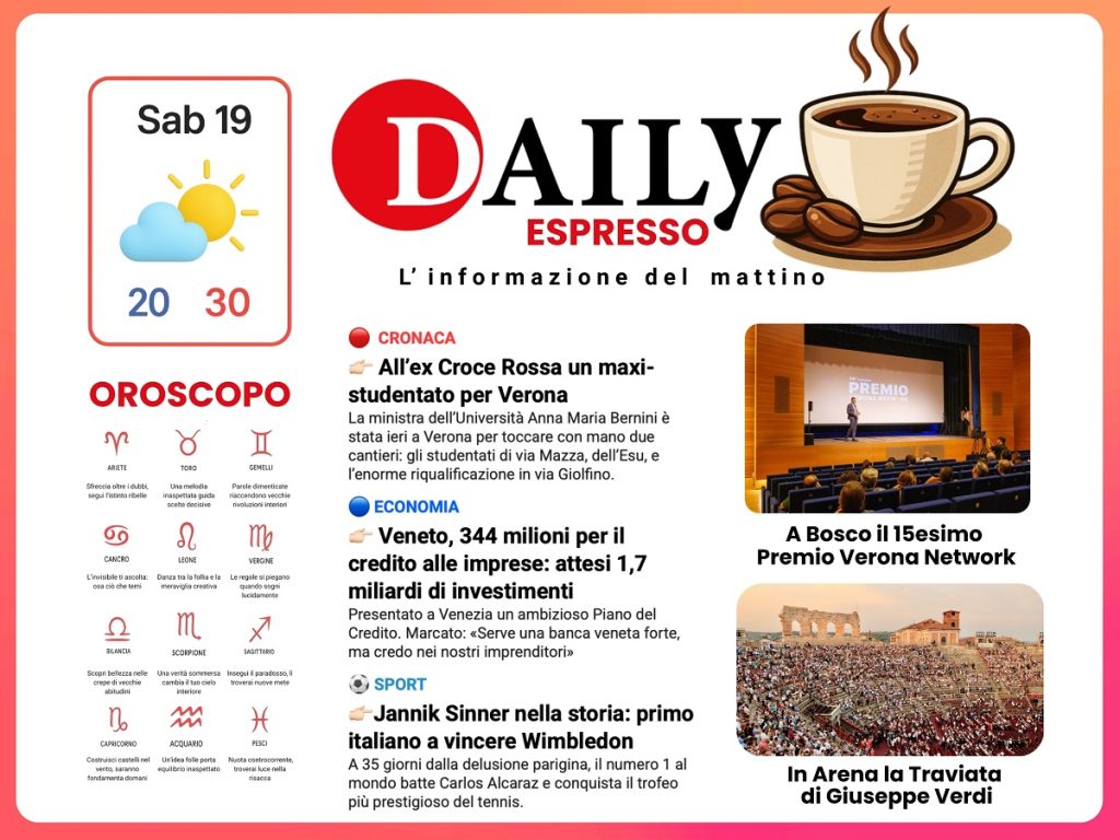 di RedazioneA partire da questo mese, un nuovo prodotto editoriale del Gruppo Verona Network per tutti i cittadini di Verona e Provincia. Ogni mattina alle 6:30, tutti gli abbonati riceveranno gratuitamente in posta o sullo smartphone “DAILY ESPRESSO“, la newsletter gratuita che offre una panoramica completa delle notizie più importanti e curiose per iniziare al meglio la giornata.