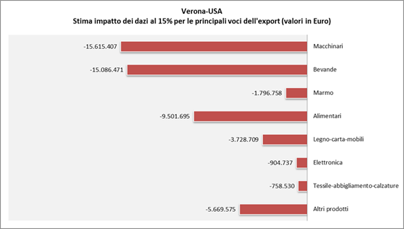 di RedazioneUna perdita stimata di circa 53 milioni di euro, equivalente a una contrazione del 6,2% delle esportazioni verso gli Stati Uniti. È a quanto ammonta l’impatto dei dazi al 15% sulle produzioni made in Verona recapitate negli Usa, anticipati ieri in seguito all’accordo raggiunto tra la Commissione europea e l’amministrazione Trump in Scozia.