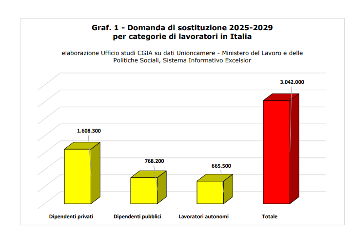 di Matteo ScolariTra il 2025 e il 2029 l’Italia dovrà affrontare un vero e proprio esodo dal lavoro: oltre 3 milioni di addetti, pari al 12,5% della forza lavoro nazionale, andranno in pensione o lasceranno l’attività, con un impatto destinato a pesare fortemente sul sistema economico. Lo rileva l’Ufficio Studi della CGIA di Mestre, che lancia l’allarme sulla necessità di programmare fin da subito strategie di sostituzione e formazione.