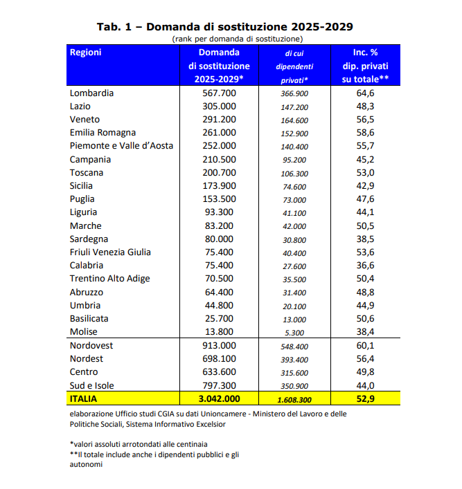 A livello settoriale, il peso più grande ricadrà sui servizi (72,5% delle uscite), con numeri elevati in commercio, sanità e Pubblica Amministrazione. Nell’industria si segnala in particolare il comparto delle costruzioni (179.300 rimpiazzi previsti), mentre l’agricoltura dovrà sostituire circa 111.200 addetti.