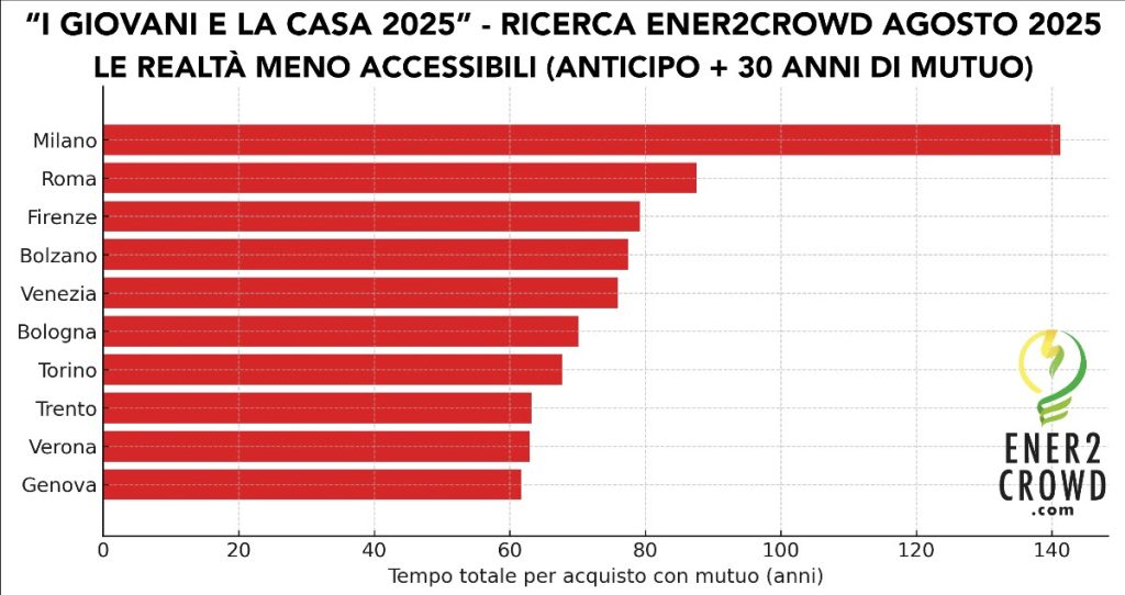 di Matteo ScolariUno studio di Ener2Crowd mostra come l’acquisto della prima casa stia diventando un traguardo sempre più irraggiungibile per le nuove generazioni. A Milano servirebbero quasi 150 anni, a Roma oltre 100, mentre a Verona – che figura tra le peggiori province – i tempi non sono meno drammatici: 63 anni con mutuo e circa 73 senza.