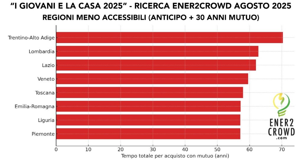 Secondo l’analisi, a livello nazionale un under 40 impiega in media 57,4 anni tra anticipo e mutuo per accedere a un appartamento di 100 mq. In Veneto lo scenario non migliora: la regione è tra le peggiori d’Italia, con una media di 59,6 anni anche con mutuo, davanti solo a Lombardia, Lazio e Trentino-Alto Adige.