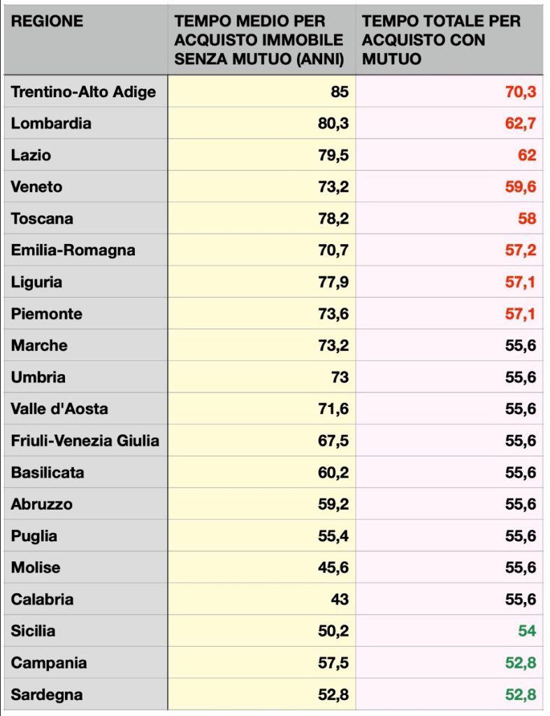 Il problema riguarda non solo le città più care ma anche i centri di provincia, dove a prezzi immobiliari più accessibili corrispondono stipendi troppo bassi per sostenere la rata del mutuo. A Crotone, Agrigento, Enna o Caltanissetta, ad esempio, pur servendo meno di 40 anni per accumulare il capitale necessario senza mutuo, la rata resta insostenibile per redditi così bassi.
