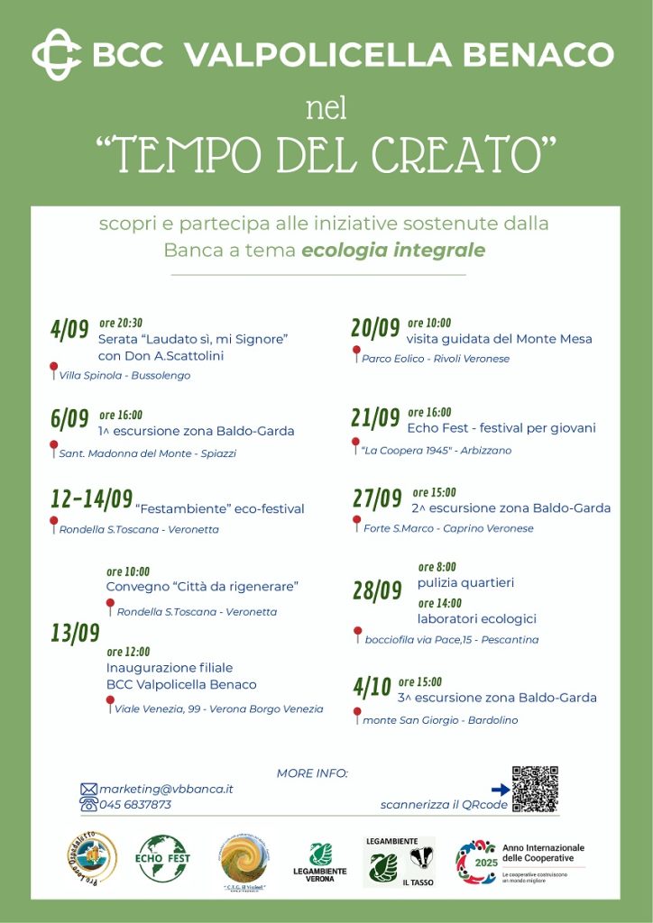 di Matteo ScolariBCC Valpolicella Benaco lancia una nuova iniziativa nel territorio veronese “BCC Valpolicella Benaco nel Tempo del Creato” valorizzando collaborazioni tra Enti locali, associazionismo, cittadini e privati e presentando un cartellone di 10 eventi che si svolgeranno tra il 4 settembre e il 4 ottobre, ricorrenza del Patrono d’Italia.