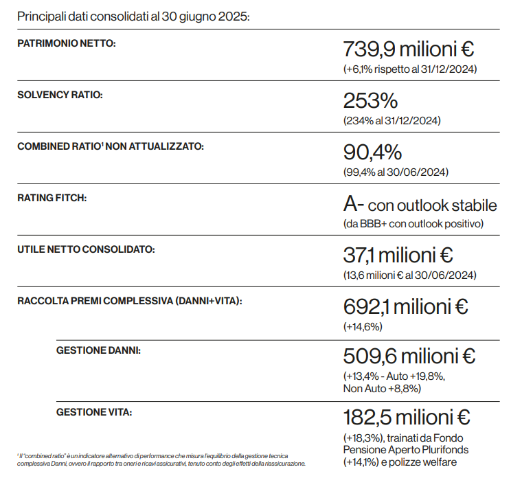 di Matteo ScolariNel primo semestre 2025, ITAS Mutua ha registrato una solida performance, con una crescita significativa sia sul fronte patrimoniale che nei premi assicurativi. Il patrimonio netto del Gruppo è salito a 739,9 milioni di euro, segnando un incremento del 6,1% rispetto alla fine del 2024. L’utile netto consolidato è arrivato a 37,1 milioni di euro, più del doppio rispetto ai 13,6 milioni di euro registrati nello stesso periodo dell’anno precedente.