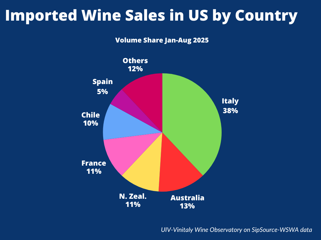 Nel 2024, le importazioni di vino italiano negli Stati Uniti hanno sfiorato i 2,3 miliardi di dollari, pari a 354 milioni di litri o oltre 470 milioni di bottiglie da 0,75 litri, confermando il mercato statunitense come il primo sbocco per l’export del vino italiano, con una quota a valore del 24% sul totale.
