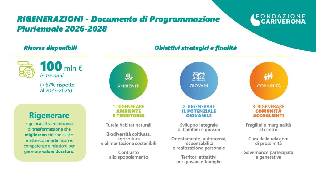 di Matteo ScolariCon il titolo “RiGenerazioni”, Fondazione Cariverona apre un nuovo ciclo strategico triennale (2026–2028) e il piano annuale 2026, che prevede risorse complessive per 100 milioni di euro (+67% rispetto al triennio precedente), di cui 33,4 milioni nel solo 2026 (+11% rispetto al 2025).