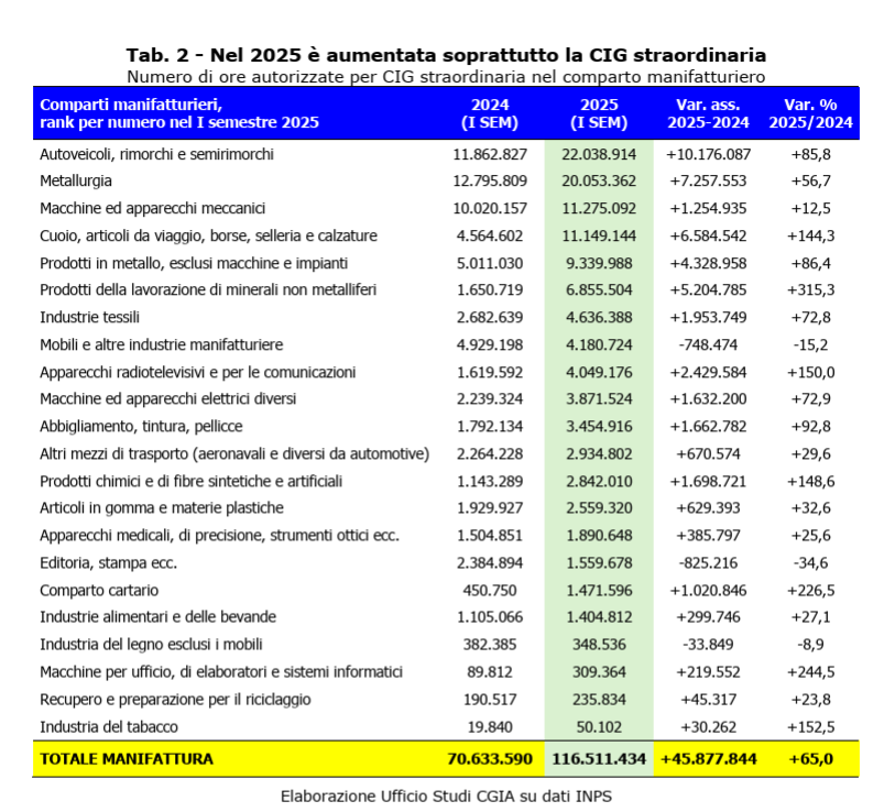 L’aumento più consistente riguarda la CIG straordinaria, che cresce del 46,4%, a fronte del +7,3% della CIG ordinaria e del crollo del 70% della CIG in deroga. I settori più colpiti sono automotive (+85,8%), metallurgia (+56,7%), macchinari (+12,5%) e calzature (+144%), che da soli rappresentano oltre il 55% del totale ore autorizzate nella manifattura.