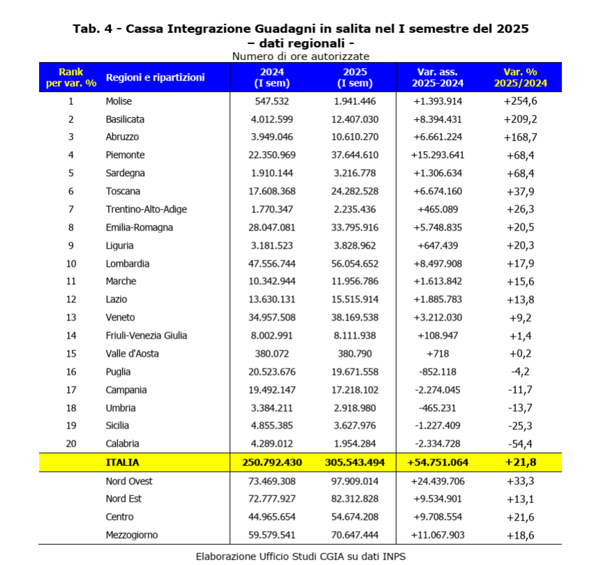 Nel complesso, il Nord-Ovest registra l’aumento più marcato delle ore di CIG (+33,3%), seguito da Centro (+21,6%), Mezzogiorno (+18,6%) e Nord-Est (+13,1%).