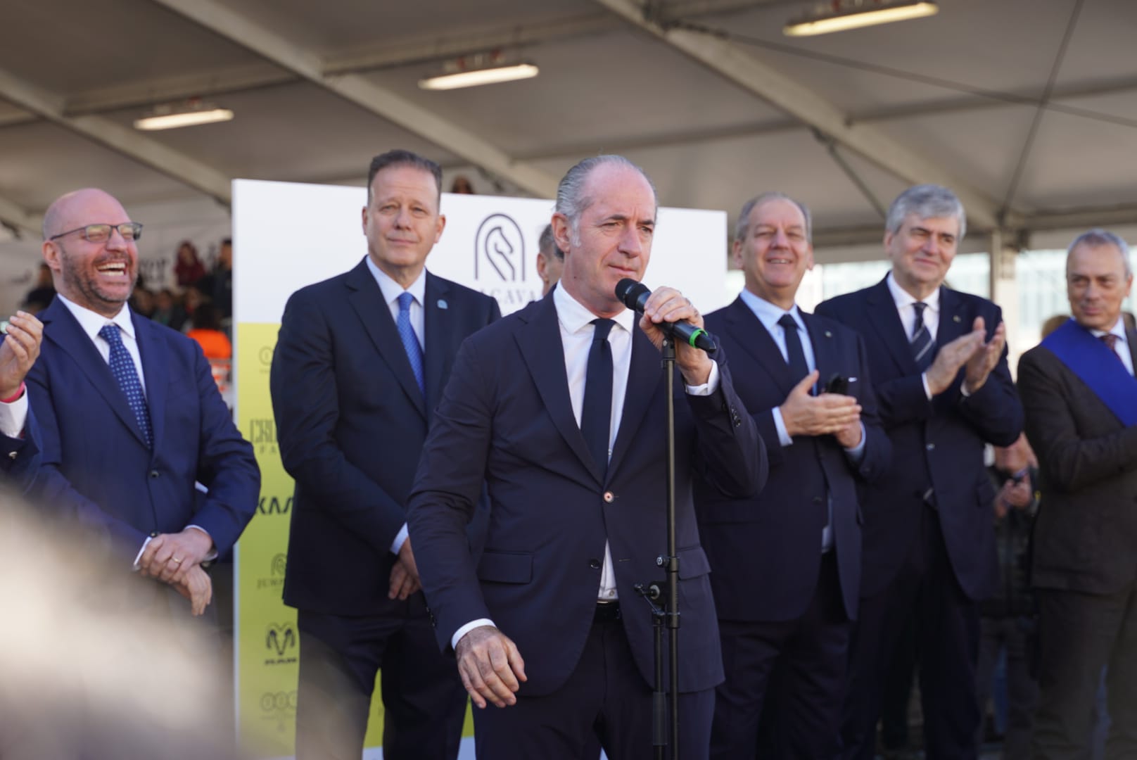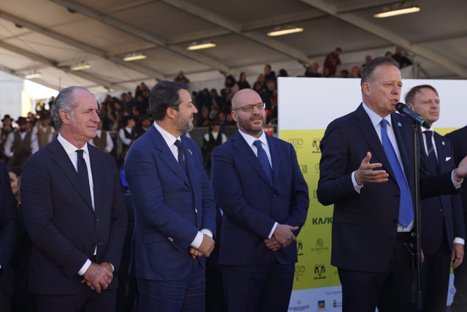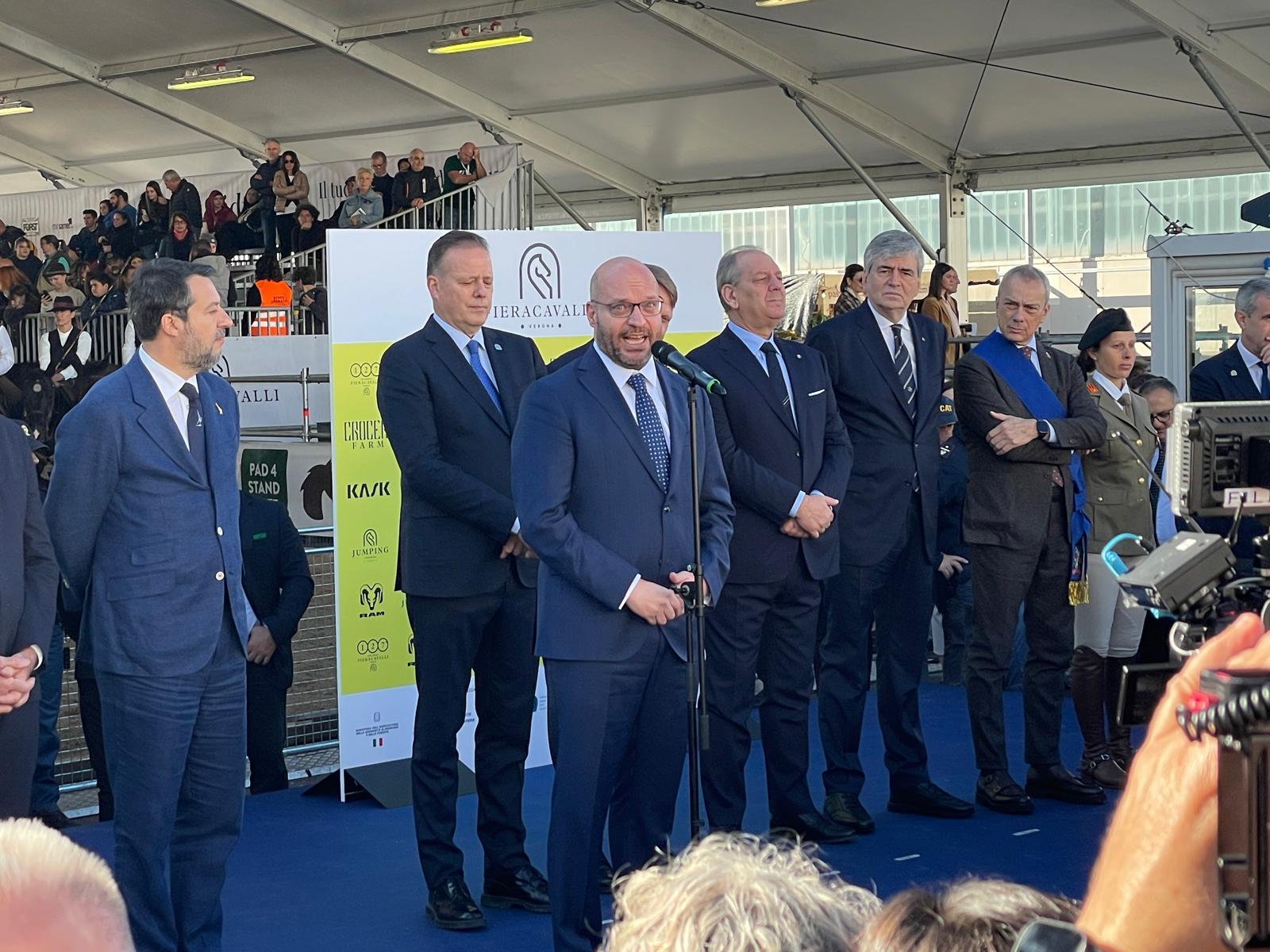 Matteo Salvini, vicepresidente del Consiglio dei Ministri: «Fieracavalli è un simbolo di Verona che guarda lontano. Oggi sono qui da vicepresidente del Consiglio e ministro delle Infrastrutture e dei Trasporti, portando in dote oltre 20 miliardi di euro di cantieri aperti in Veneto. La nuova Alta Velocità Brescia-Verona-Vicenza-Padova renderà più rapidi e sicuri gli spostamenti nel Lombardo-Veneto; i lavori al corridoio del Brennero avvicineranno ancora di più Verona al cuore dell’Europa, riducendo sensibilmente i tempi di viaggio tra Monaco e Milano. È un cambiamento concreto per residenti, turisti e imprese. E poi le Olimpiadi 2026: con la cerimonia di chiusura a Verona, la città sarà sotto i riflettori del mondo».