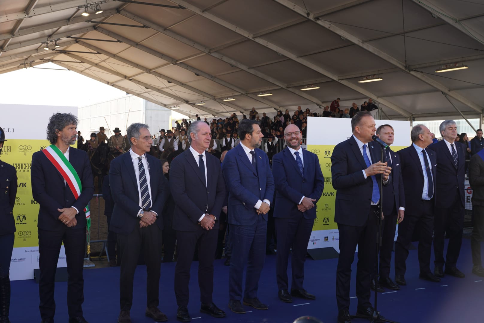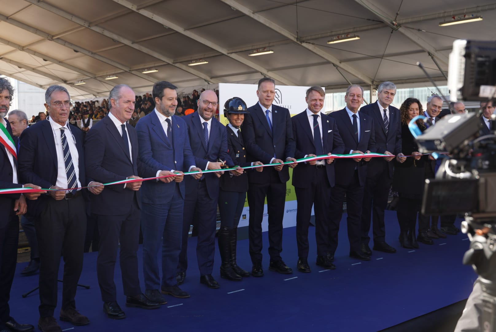 Al taglio del nastro della 127ª Fieracavalli, oggi, con la fanfara a cavallo della Polizia di Stato e il 4° Reggimento Carabinieri a cavallo, sono intervenuti: Lorenzo Fontana, presidente della Camera dei Deputati, Matteo Salvini, vicepresidente del Consiglio, Francesco Lollobrigida, ministro dell’Agricoltura, della Sovranità alimentare e delle Foreste, Luca Zaia, presidente della Regione Veneto, Damiano Tommasi, sindaco di Verona, Flavio Massimo Pasini, presidente della Provincia di Verona, Federico Bricolo, presidente di Veronafiere, Marco Di Paola, presidente della FISE, Matteo Zoppas, presidente di ITA-Italian Trade Agency, e Giulia Martinengo Marquet, primo graduato dell’Aeronautica militare e campionessa italiana di salto ostacoli.