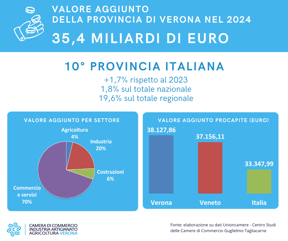 di Matteo ScolariVerona consolida il suo ruolo di motore economico tra i più forti d’Italia, con un valore aggiunto che nel 2024 ha raggiunto 35,4 miliardi di euro, pari all’1,8% del totale nazionale e al 19,6% del valore regionale. La provincia scaligera si colloca così al decimo posto nella classifica italiana, secondo l’analisi della Camera di Commercio di Verona basata sui dati del Centro Studi Tagliacarne e di Unioncamere.