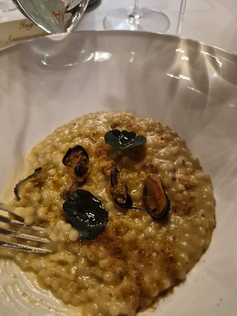 Marco Marras, chef del Ristorante Oseleta, ha accolto i colleghi raccontando il dialogo tra acqua e terra, tra i prodotti del Garda e l’anima della sua Sardegna, dando vita a una cucina armoniosa e ancorata alla stagionalità. La sua proposta per la cena ha visto un connubio tra ingredienti veneti e sardi: fregola di grano duro, bottarga, lime e cozze, insieme a carne locale e pesce di lago, fino alla creazione delle sue “coccole finali”.