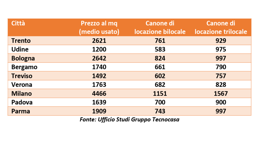 Nel quadro delle città del Nord-Est si distingue Treviso, che registra nuovi aumenti grazie alle recenti costruzioni nelle zone Fiera e Stadio, vendute tra 4000 e 5000 €/mq per gli affacci sul Sile. La nuova pista ciclopedonale, insieme alla vicinanza a Venezia e alla presenza di studenti fuori sede, alimenta la domanda anche per affitti turistici.