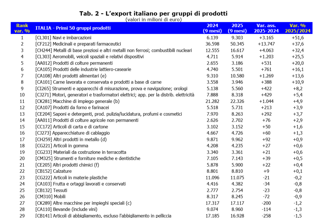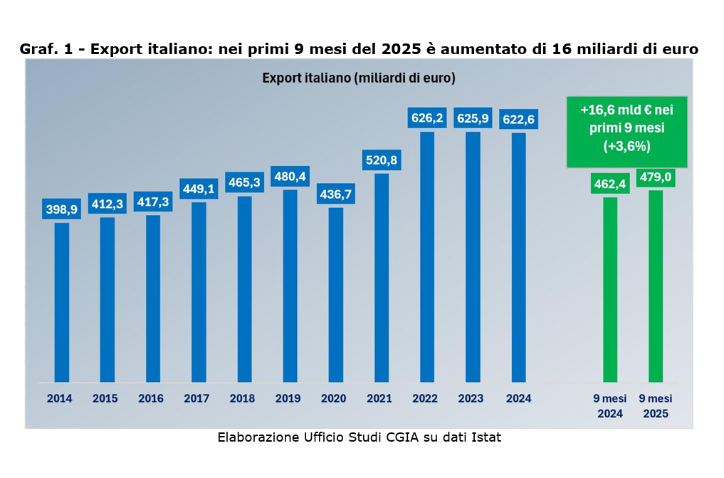Un risultato significativo se si considera il contesto internazionale complesso. Secondo la CGIA, nel terzo trimestre 2025 l’Italia ha esportato merci per quasi 190 miliardi di dollari, collocandosi alle spalle solo di Cina, Stati Uniti e Germania. Un dato che conferma la tenuta strutturale del sistema produttivo italiano e la forza del made in Italy sui mercati internazionali.