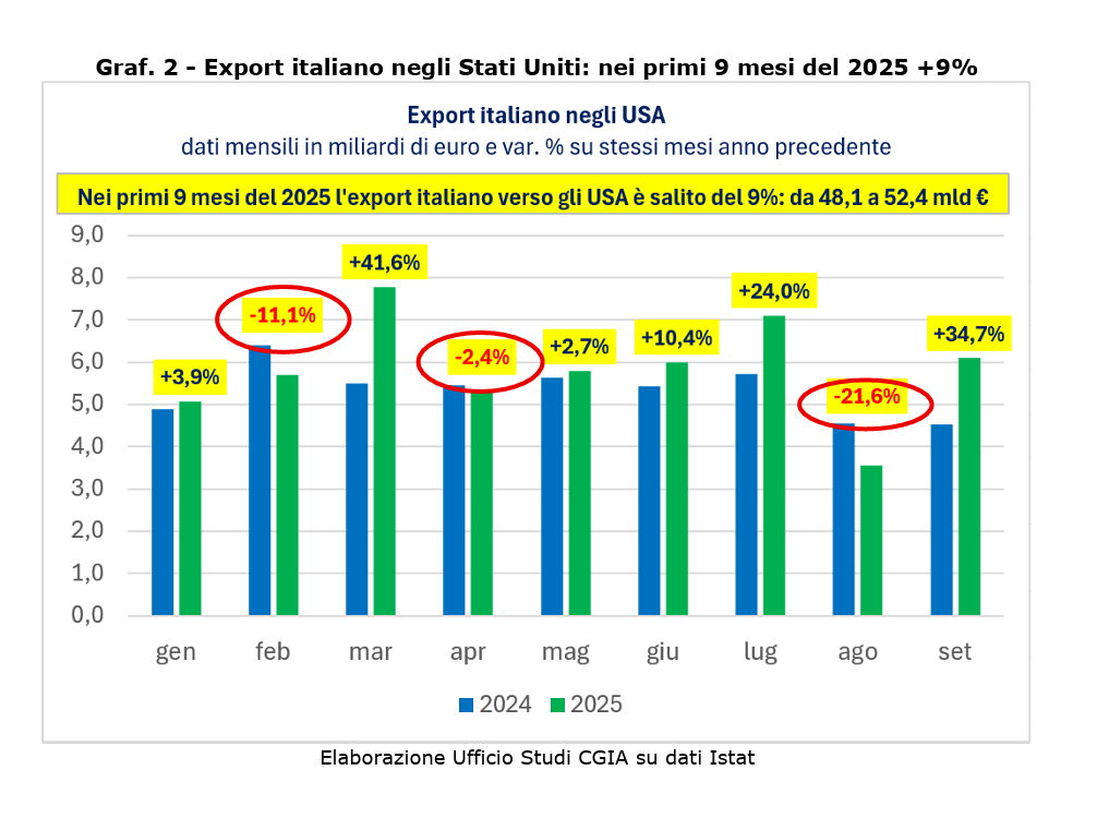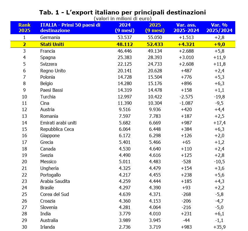 Particolarmente rilevante è l’andamento delle vendite verso gli Stati Uniti, che nei primi nove mesi del 2025 sono cresciute del 9%, passando da 48,1 a 52,4 miliardi di euro, dopo il calo registrato nel 2024 (-3,3%). Un recupero che, secondo gli analisti CGIA, smentisce l’ipotesi di un impatto immediato e negativo dei dazi introdotti dall’amministrazione Trump. Anzi, a settembre 2025 l’export italiano verso gli USA ha segnato un balzo del +34,7% su base annua.