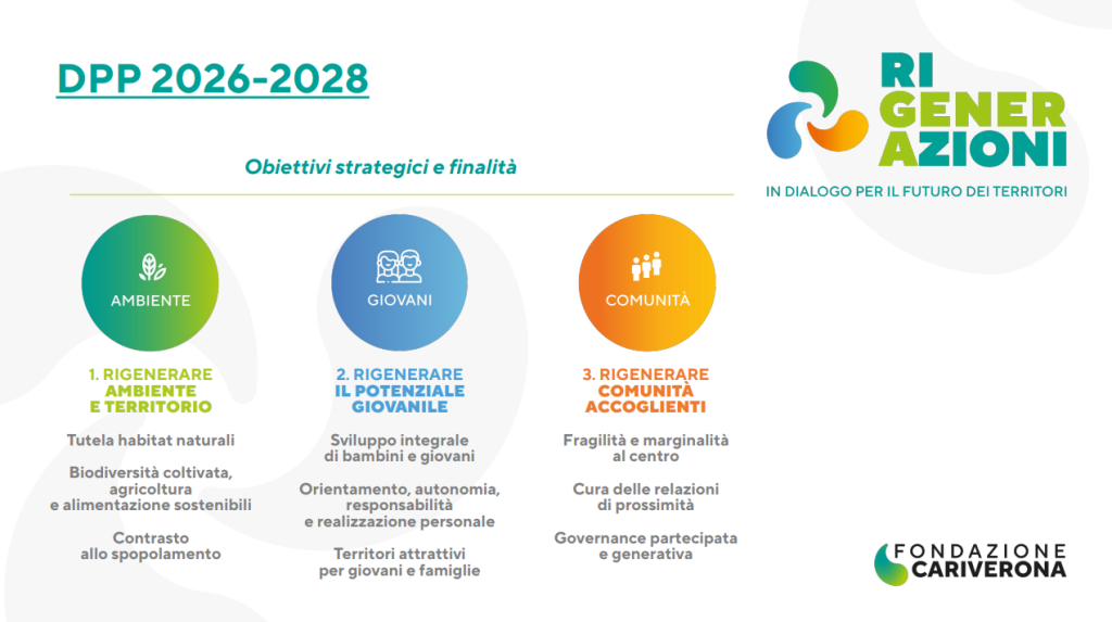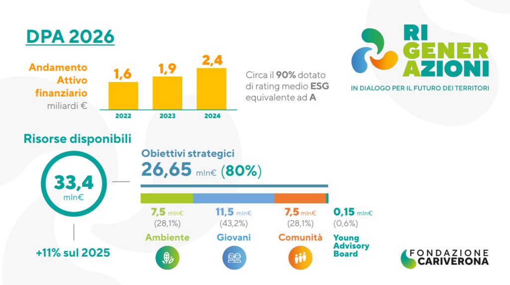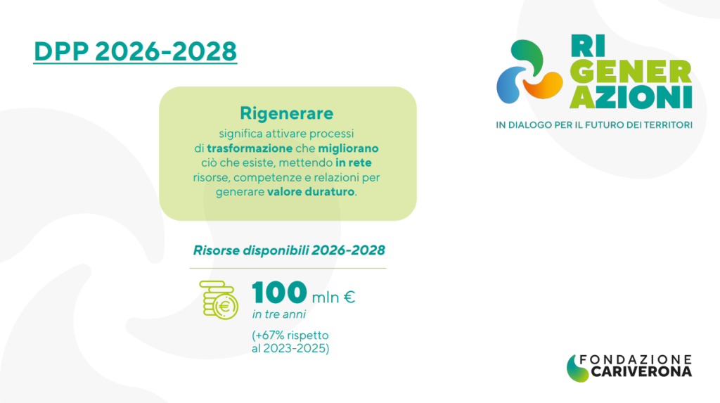 di Matteo ScolariA poco più di un mese dalla presentazione dei documenti di programmazione pluriennale 2026-2028 e annuale 2026, Fondazione Cariverona è stata protagonista di una puntata speciale di Focus Verona Economia. Ospiti in studio il presidente Bruno Giordano e il direttore Filippo Manfredi, che hanno illustrato la visione, le priorità strategiche e gli investimenti previsti per i prossimi anni: 100 milioni di euro in tre anni, con un incremento del 67% rispetto al triennio precedente. Al centro della nuova programmazione il concetto di “rigenerazioni”, inteso come rigenerazione dell’ambiente e del territorio, del potenziale giovanile e delle comunità, attraverso un approccio basato sull’ascolto, sull’impatto e sulla creazione di valore condiviso.